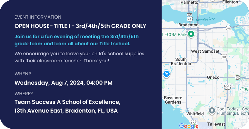 This OPEN HOUSE- TITLE I meeting is only for students in 3rd, 4th and 5th grade and their parents/guardians only.