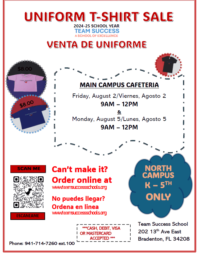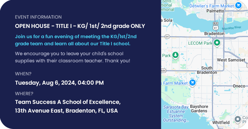 Here at Team Success, we strive to stimulate your child’s interests and abilities in a warm, supportive atmosphere. Get ready for the new school year by coming to Open House on Tuesday, August 6, 2024 from 4:00pm-6:00pm. This is a perfect opportunity to meet your child’s teacher and explore their classroom. We look forward to making the beginning of school life an exciting and rewarding time.