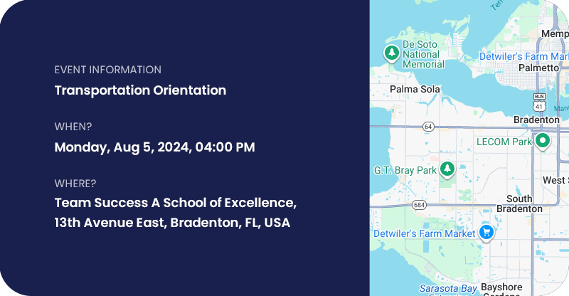 Join us in the North Campus- main cafeteria on Monday, August 5, 2024 from 4:00pm-6:00pm to get information about the before and after school bus routes.